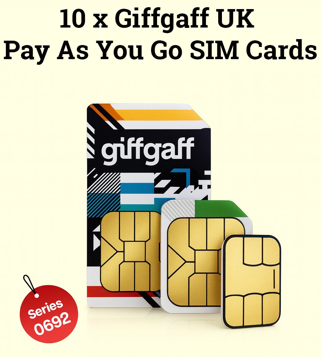 Get excellent value with this Bulk Pack of 10 Giffgaff UK Pay As You Go SIM Cards – Series 0692.
