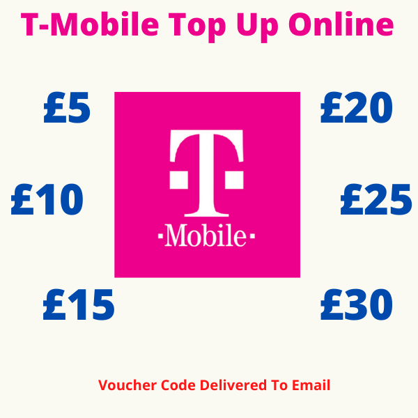 | Amount | £5 T-Mobile Top Up Voucher Code, £10 T-Mobile Top Up Voucher Code, £15 T-Mobile Top Up Voucher Code, £20 T-Mobile Top Up Voucher Code, £25 T-Mobile Top Up Voucher Code, £30 T-Mobile Top Up Voucher Code |