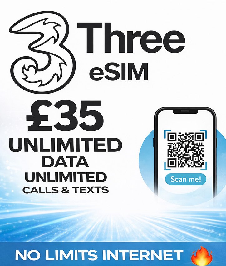 Three UK eSIM £35 – Unlimited Data | Unlimited Calls & Texts | No Limits Internet